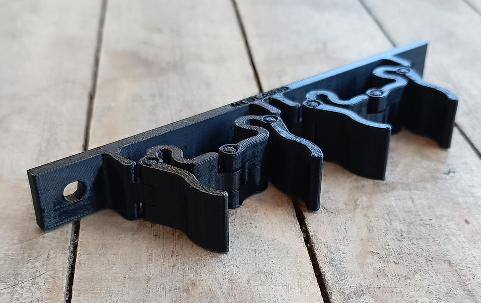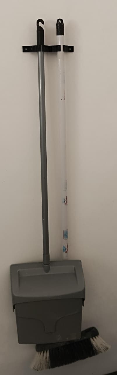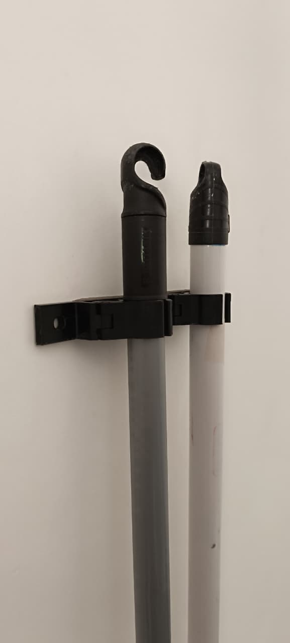 Suporte resistente para pendurar também mops, pá, rodos, etc.